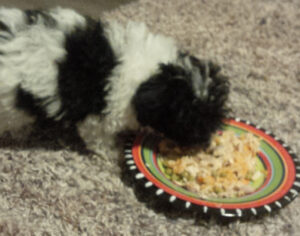 My little sweet baby toy breed dogs like to eat from flat salad dishes that are part of a porcelain dishware set. It’s easier for them to pick at the choice of food in the dish than if the food were piled in a bowl. Of course, those dishes also go in the dishwasher after every meal.